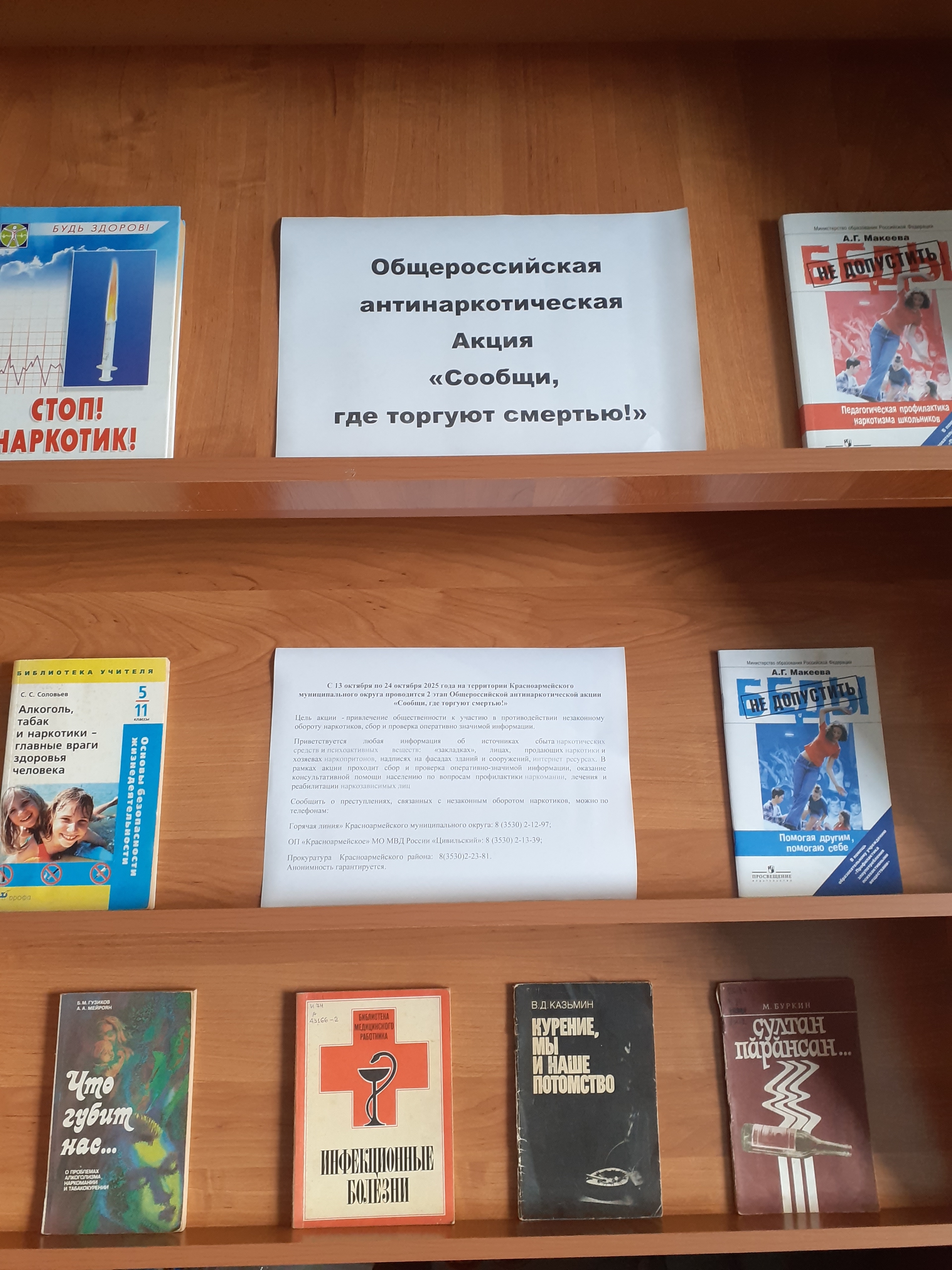 С 13 по 24 октября проходит второй этап Общероссийской антинаркотической акции « Сообщи, где торгуют смертью». Основная цель акции - привлечь внимание общественности к вопросам противодействия наркомании. В рамках акции в Яншихово-Чёллинской сельской библиотеке с учащимися провели информационный час «Мир без наркотиков». Библиотекарь рассказала о пагубном влиянии наркотиков на организм человека, в какой страшный плен они могут захватить человека, о мерах борьбы с наркозависимостью.