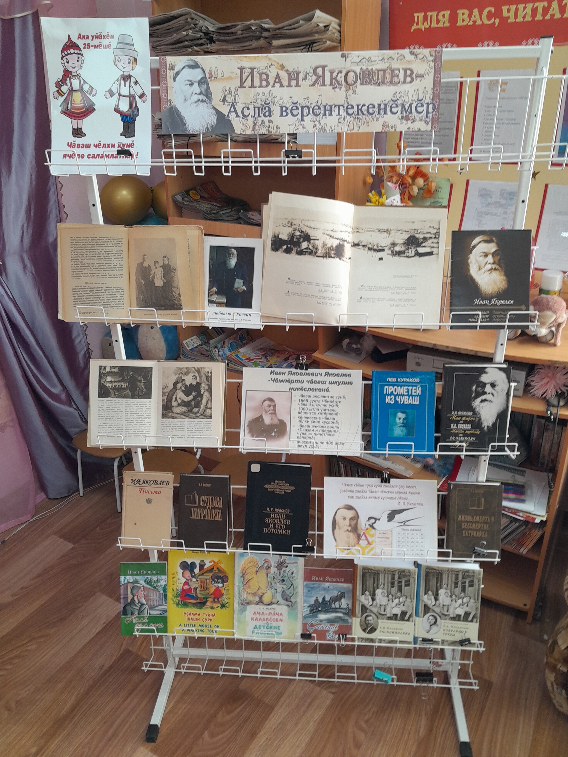 На выставке представлены книги о жизни и деятельности Яковлева, а также его литературные произведения для детей. Иван Яковлевич был не только педагогом и организатором народных школ, но и создателем чувашского алфавита, автором учебников по чувашскому и русскому языкам, писателем, переводчиком и собирателем фольклора. Его имя навсегда останется в истории чувашского народа, а его «Завещание чувашскому народу» содержит глубокие духовные и нравственные наставления, актуальные и по сей день.