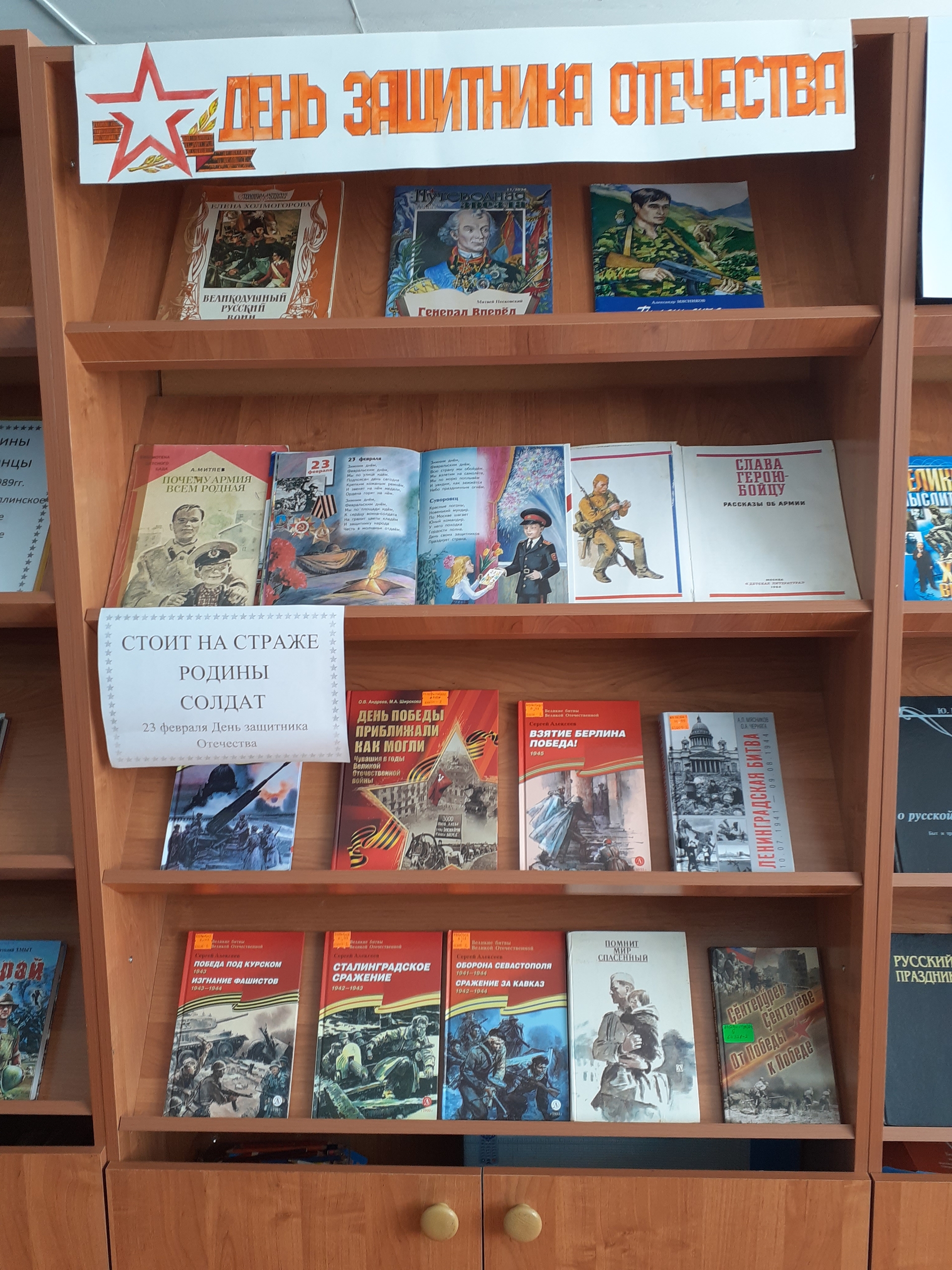 В преддверии праздника в Яншихово-Чёллинской сельской библиотеке оформлена выставка «Стоит на страже Родины солдат», на которой разместились книги военно-патриотического содержания. Книги, представленные на выставке, помогают совершить исторический экскурс в героическое прошлое нашей страны, узнать о великих подвигах, об известных войнах, славных победах российских войн, которые сыграли решающую роль в истории Отечества. Значительное место на выставке занимает литература о Великой Отечественной войне.