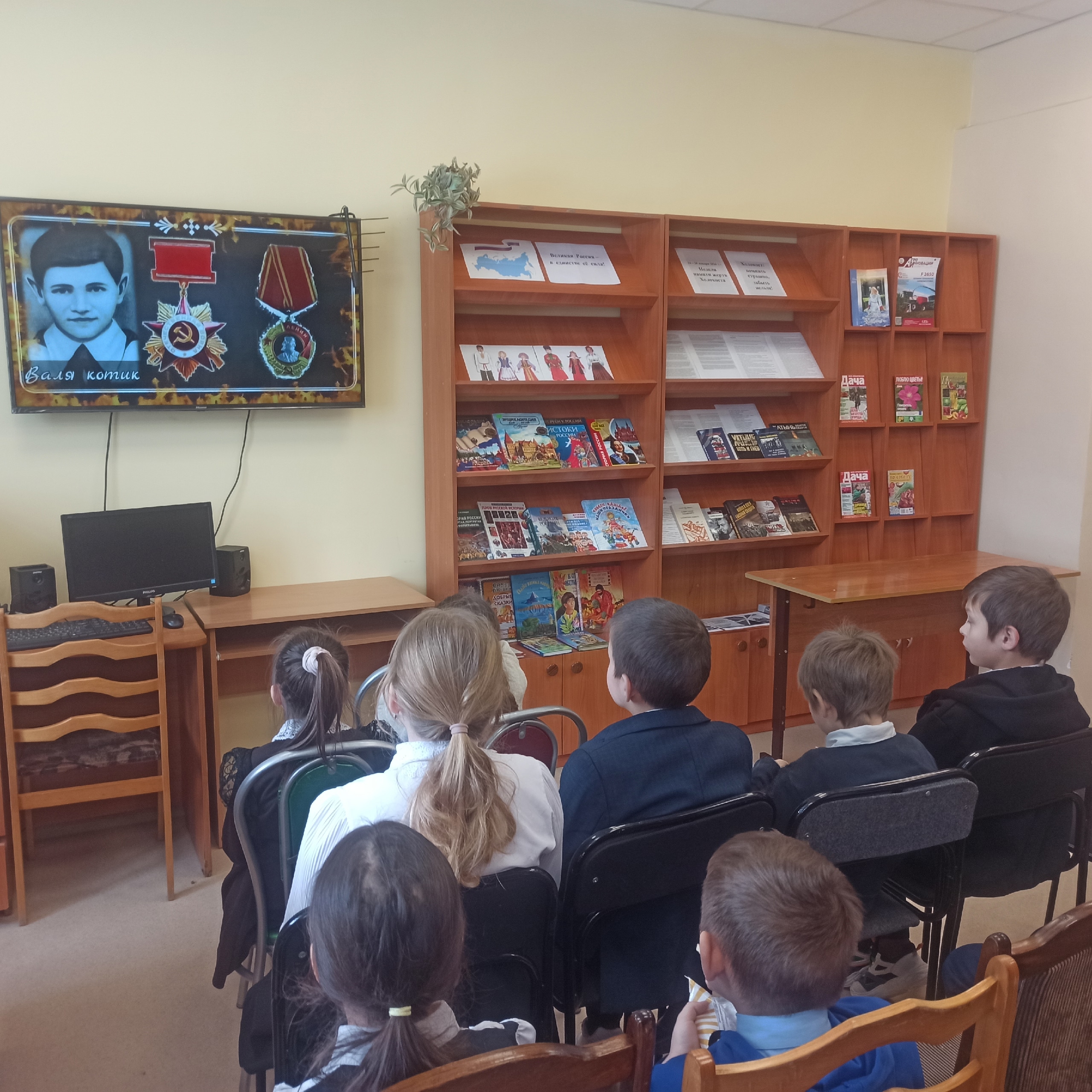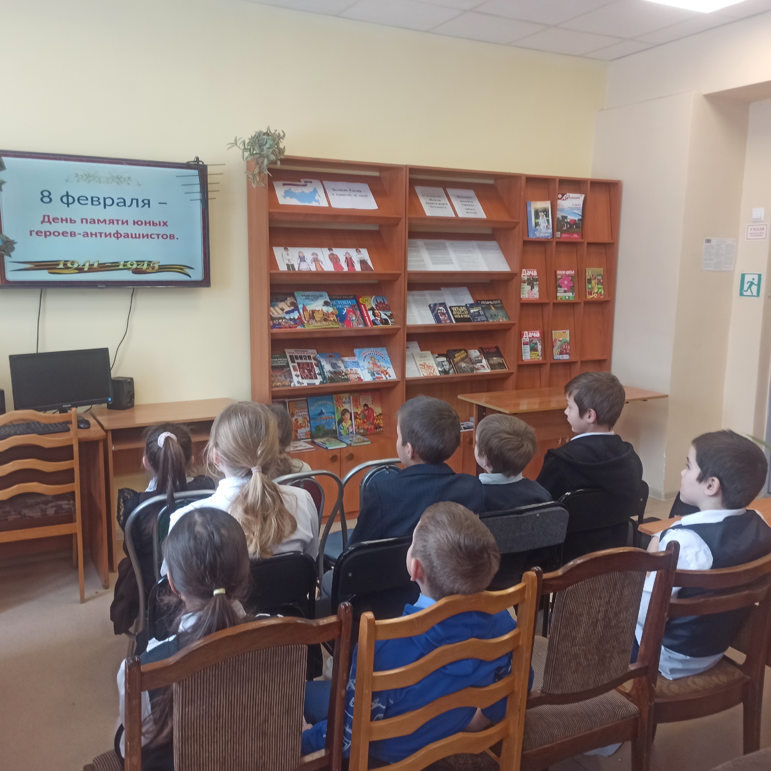 С учащимися начальных классов организован час мужества «Юные герои сороковых», посвящённый дню памяти юных героев-антифашистов. Пройдясь по страницам истории, читатели узнали о юных мальчиках и девочках, которые в годы войны боролись и умирали за свободу и счастье своей Родины, своего народа, как наравне с взрослыми дети участвовали в военных действиях и своими делами и поступками помогали взрослым приближать долгожданную Победу. Ребята услышали о подвигах своих сверстников. В ходе мероприятия участникам был показан ролик портретов пионеров-героев с рассказами об их подвигах.