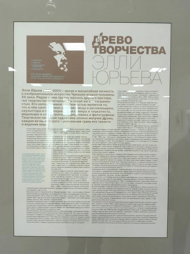 «Элли Юрьев – яркая и масштабная личность в изобразительном искусстве Чувашии второй половины ХХ века. Рядом с ним трудно назвать другого мастера, чье творчество отличалось бы такой же многогранностью. Его наследие словно могучее Древо, каждая ветвь которого – уникальная грань его таланта и видения мира», – отметила экскурсовод Булганина Анастасия Николаевна.