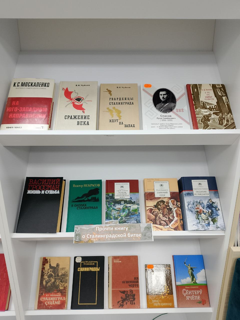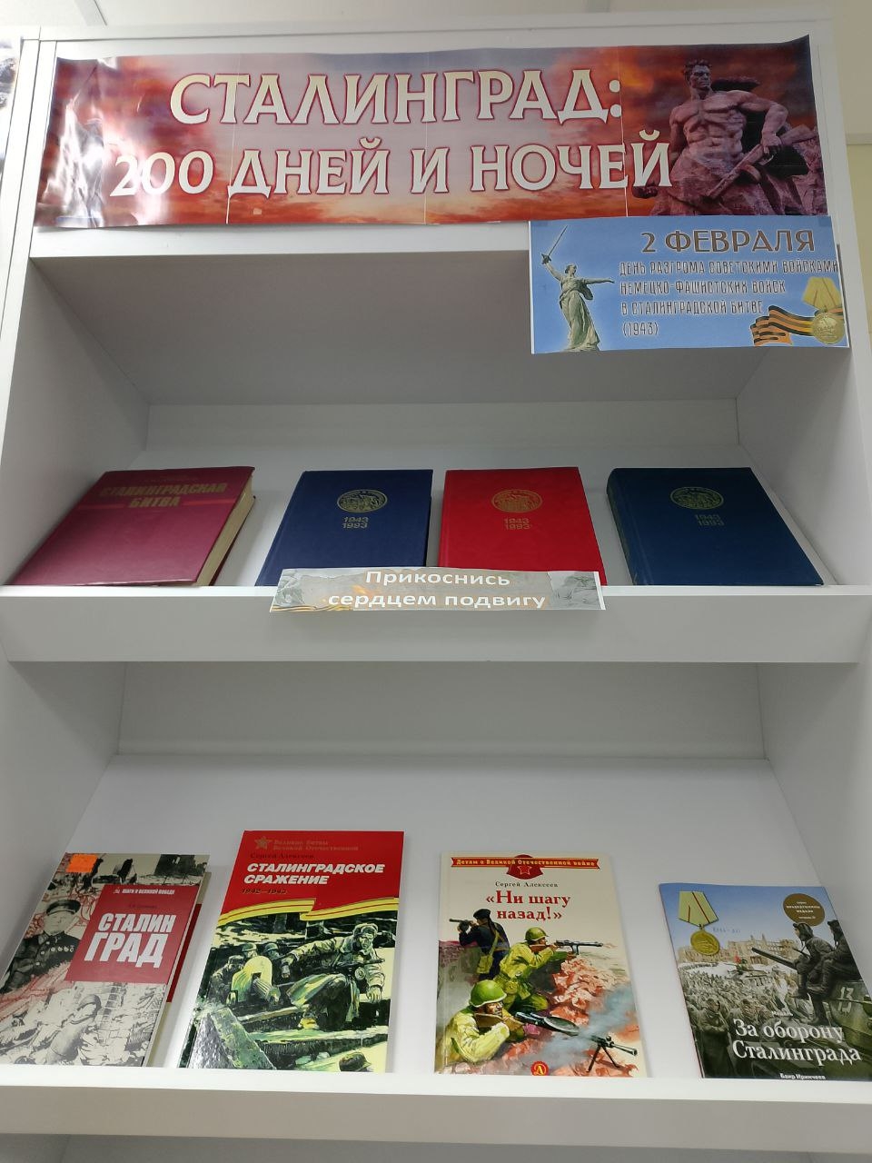 К 83-ой годовщине Сталинградской битвы в Красноармейской центральной библиотеке оформлена выставка-реквием «Сталинград: 200 дней и ночей». Вниманию читателей представлены документальные и архивные материалы, содержащие воспоминания советских военачальников Г. К. Жукова, А. М. Василевского, К. К. Рокоссовского, В. И. Чуйкова, А. И. Еремено и других участников битвы, книга академика А. М. Самсонова «Сталинградская битва», а также художественные произведения очевидцев тех событий: В. Некрасова «В окопах Сталинграда», Ю. Бондарева «Горячий снег», В.С. Гроссмана «Жизнь и судьба», К. Симонова «Живые и мертвые».