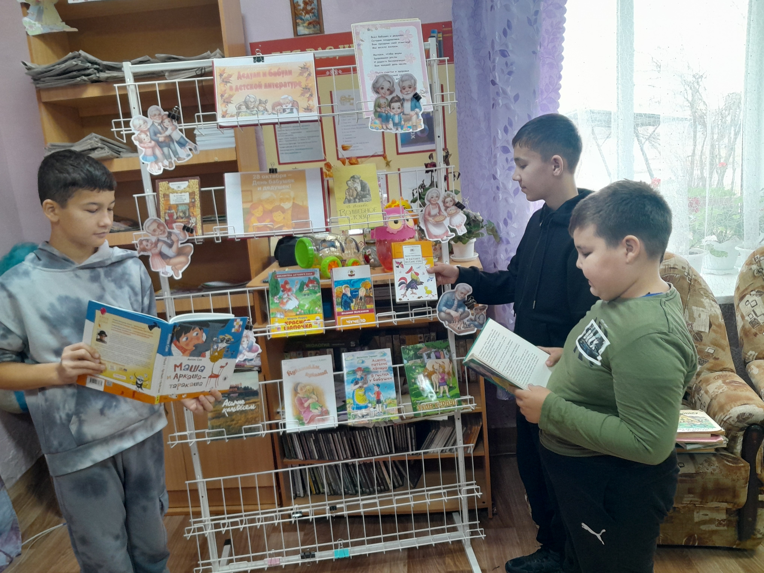На книжной выставке «Дедули и бабули в детской литературе» ребята познакомились с рассказами и сказками, в которых главные герои — бабушки и дедушки. Они с интересом отвечали на вопросы викторины «Сказочные бабули и дедули».