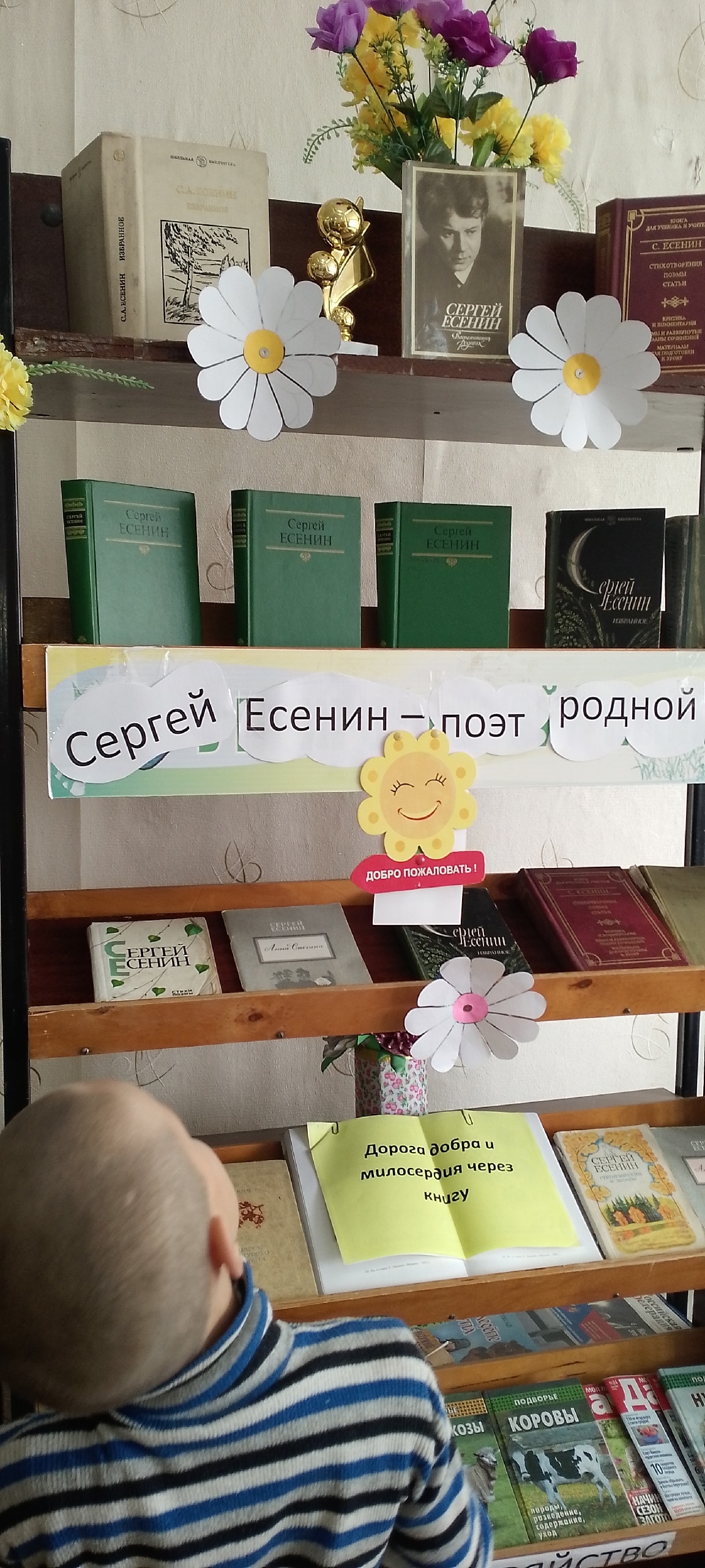 Поэт жил и творил в 1895-1925 годах. Была организована выставка его книг и сочинения детей, интересующихся творчеством Есенина. Библиотекарь Шачкина Л. Ю. познакомила творчеством Есенина. К вершинам поэзии Есенин поднялся из глубин народной жизни. "Рязанские поля, где мужики косили, где сеяли свой хлеб" стали колыбелью его поэзии. Есенин не только прекрасно знал жизнь крестьянской России, он был его сыном, болел её болями, радовался её радостями.