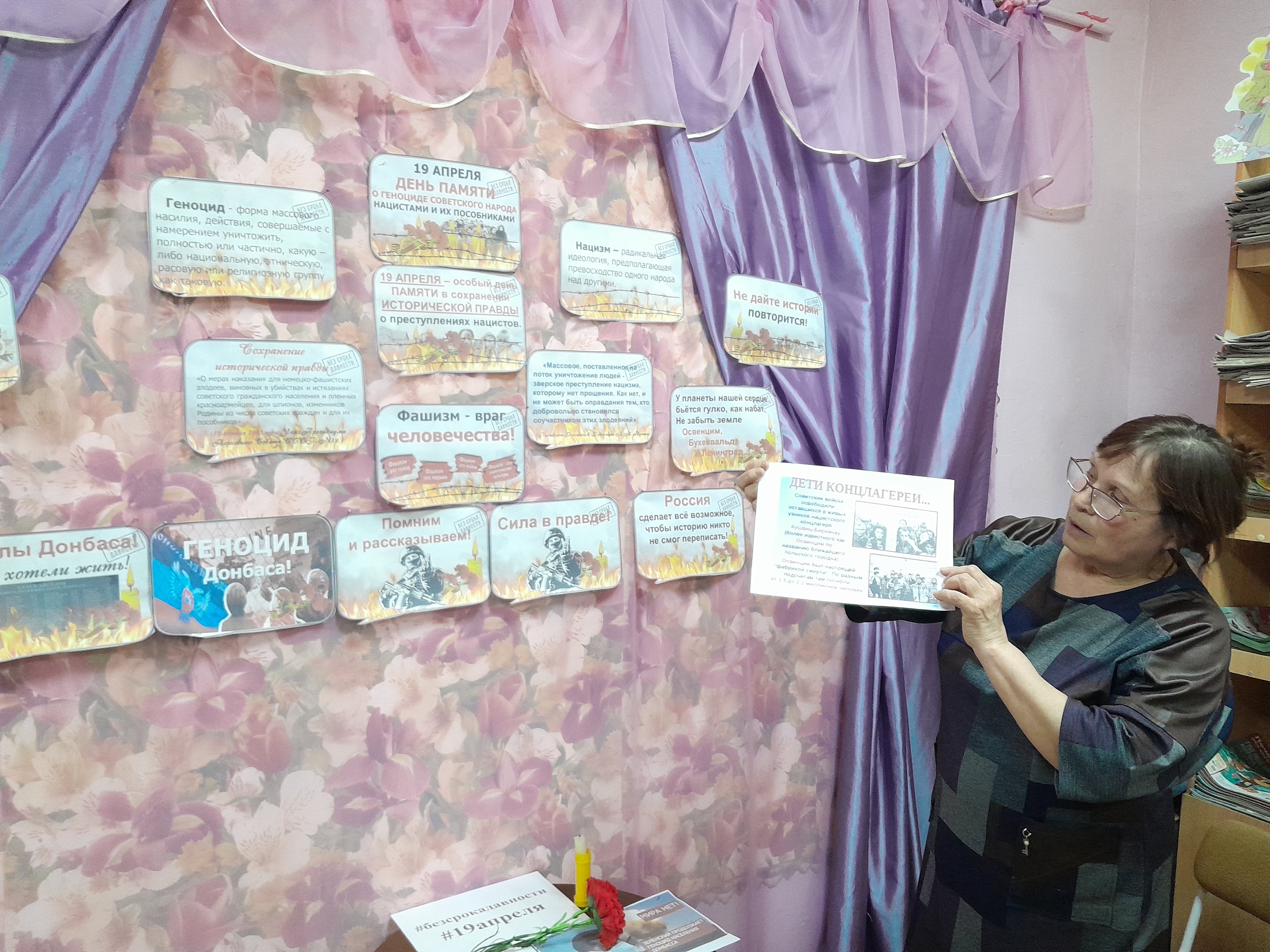В рамках данного памятного дня в Исаковской сельской библиотеке была проведена информационная акция «Забыть не вправе», нацеленная на молодежь и подростков. Библиотекарь рассказала участникам о массовых расстрелах, депортациях и других преступлениях против человечности, совершенных нацистами и их пособниками на оккупированных территориях. Эти страшные события оставили яркий след в истории и требуют от нас не только памяти, но и осознания необходимости предотвращения повторения подобных трагедий.