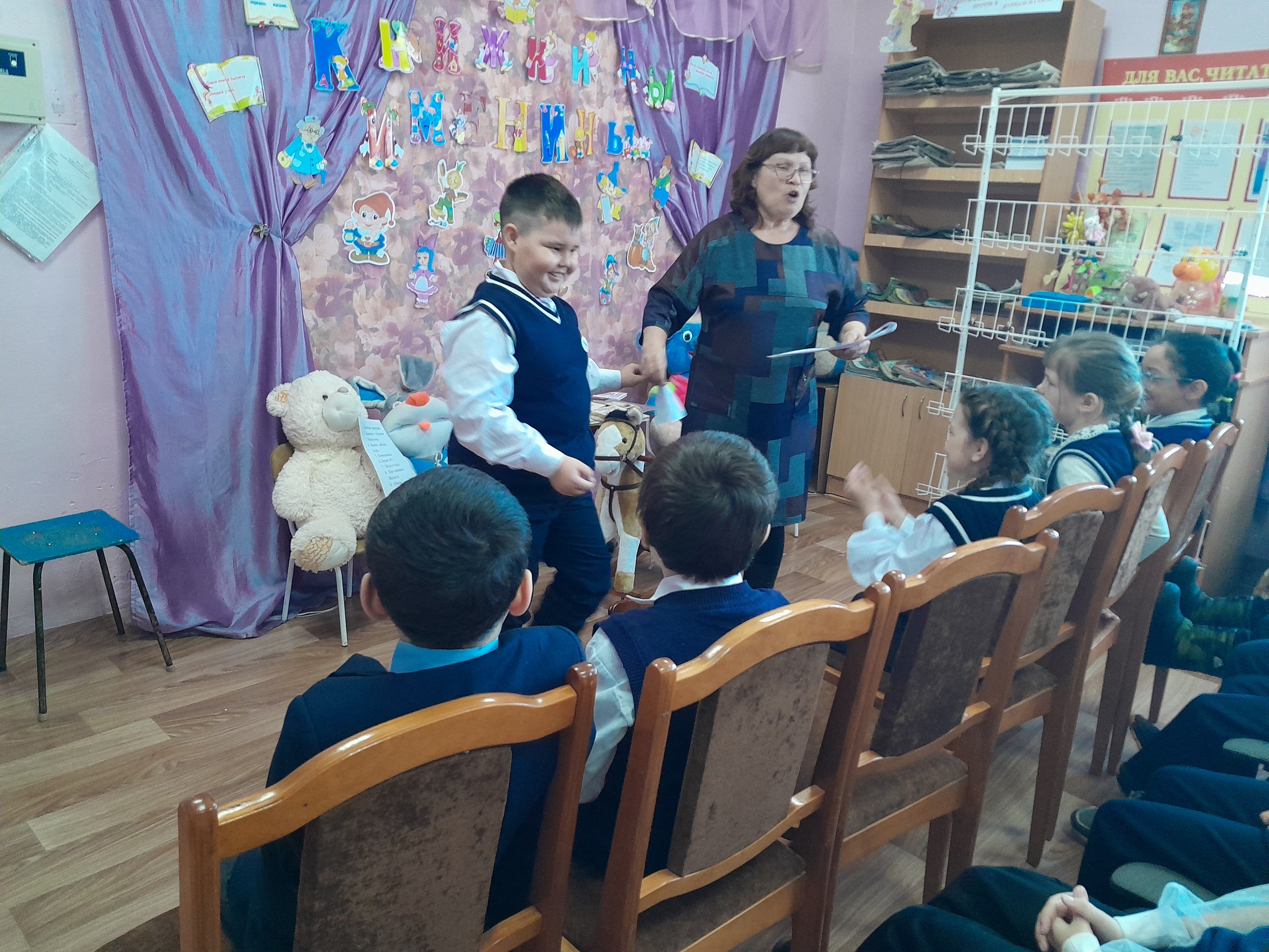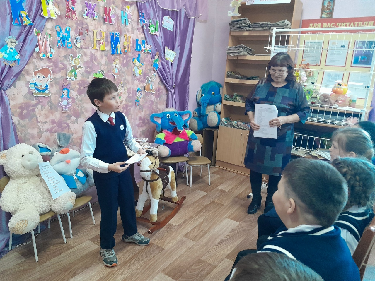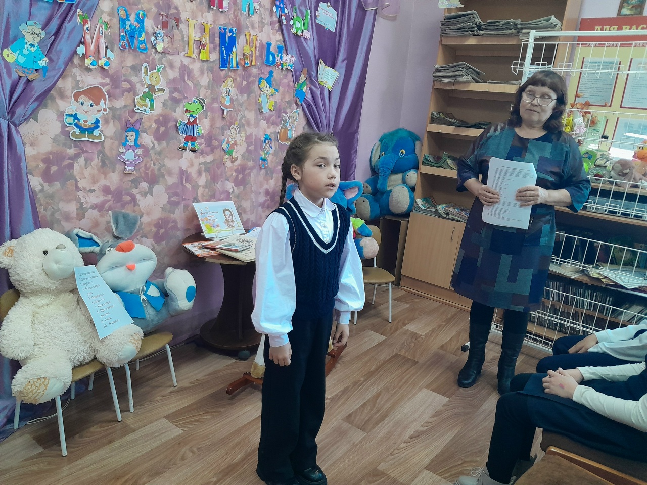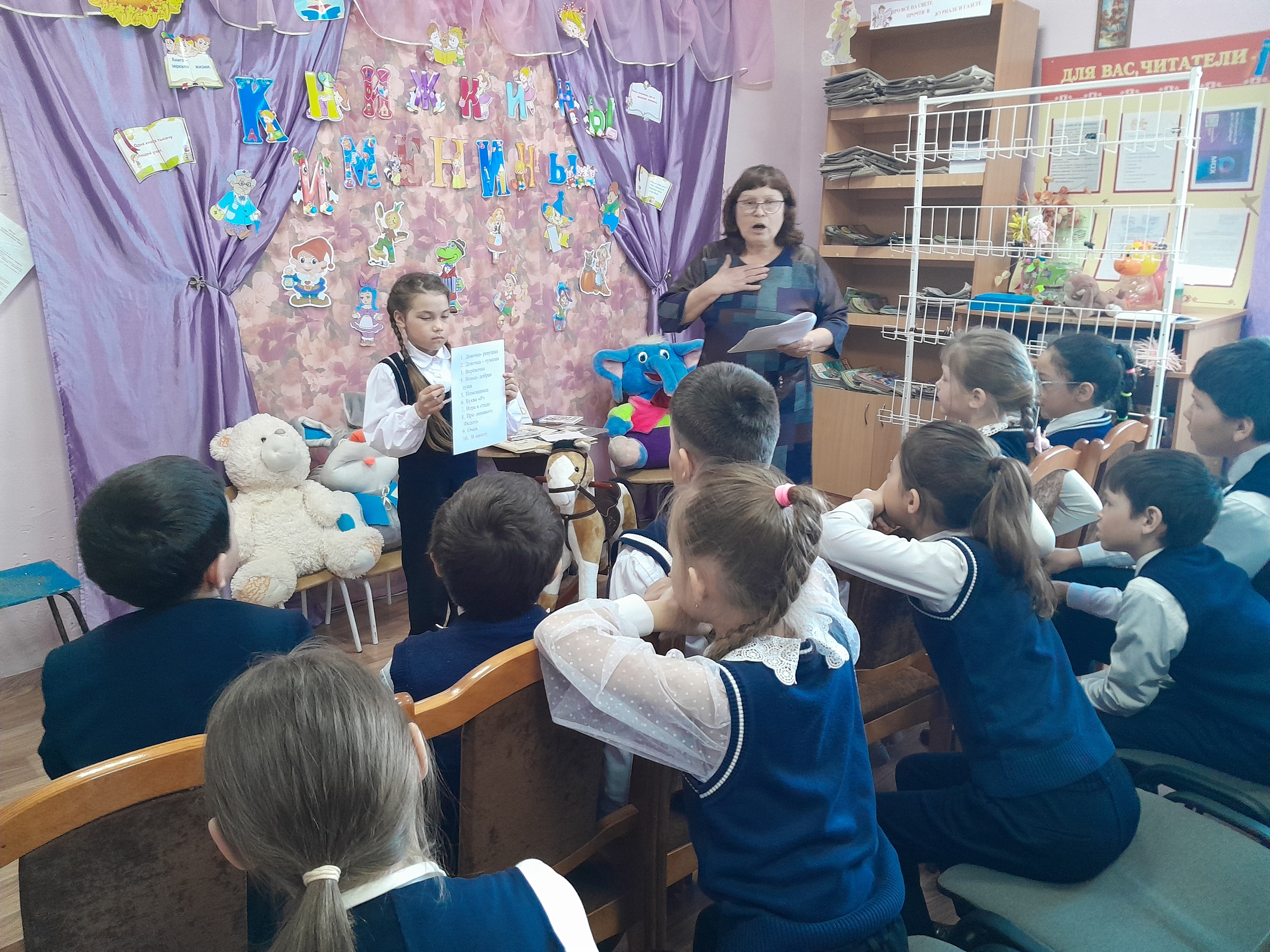 Библиотекарь начала с увлекательной беседы о биографии и творчестве Агнии Барто, раскрыв интересные факты из ее жизни. Затем все вместе прочитали известное стихотворение «Наша Таня громко плачет», а также вспомнили другие произведения поэтессы, такие как истории о грустном плюшевом мишке, трусливом бычке и зайчонке под дождем.